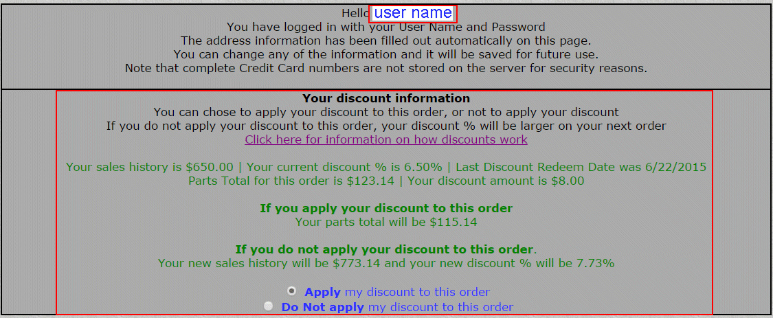 Your user name and discount information displays in my checkout screen
